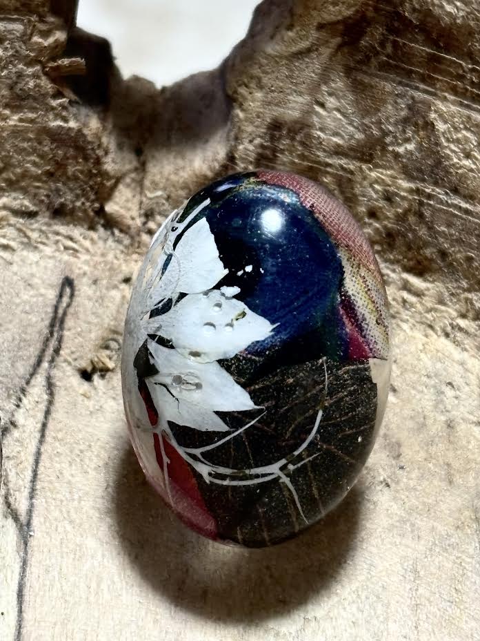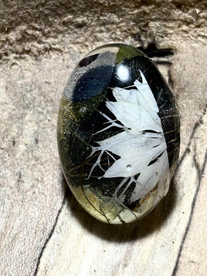 These handcrafted studs feature a real pressed larkspur, preserved beneath clear resin against a richly decoupaged background that adds depth and moody contrast. Soft ivory petals drift across layered tones of forest green, deep blue, and shadowed hues, creating the feeling of flowers caught in evening light.