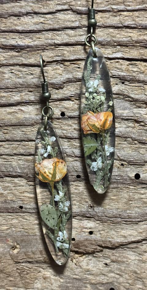 Suspended from antique gold ear wires, these elongated botanical silhouettes feel both heirloom and untamed. Soft petals meet structured form, capturing the quiet romance of a forgotten cottage garden at dusk.