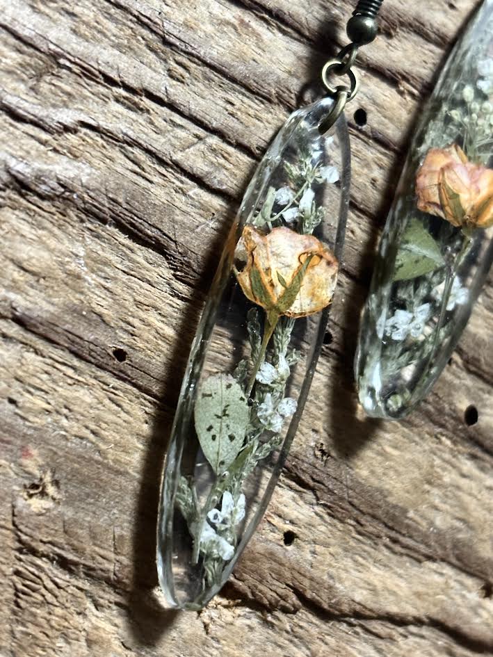 Whole miniature roses are carefully preserved in crystal-clear resin, paired with airy Queen Anne’s lace and natural greenery. Each bloom remains intact — a full garden moment suspended in time.
