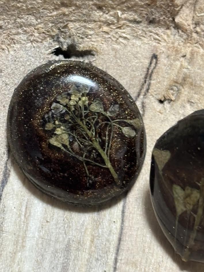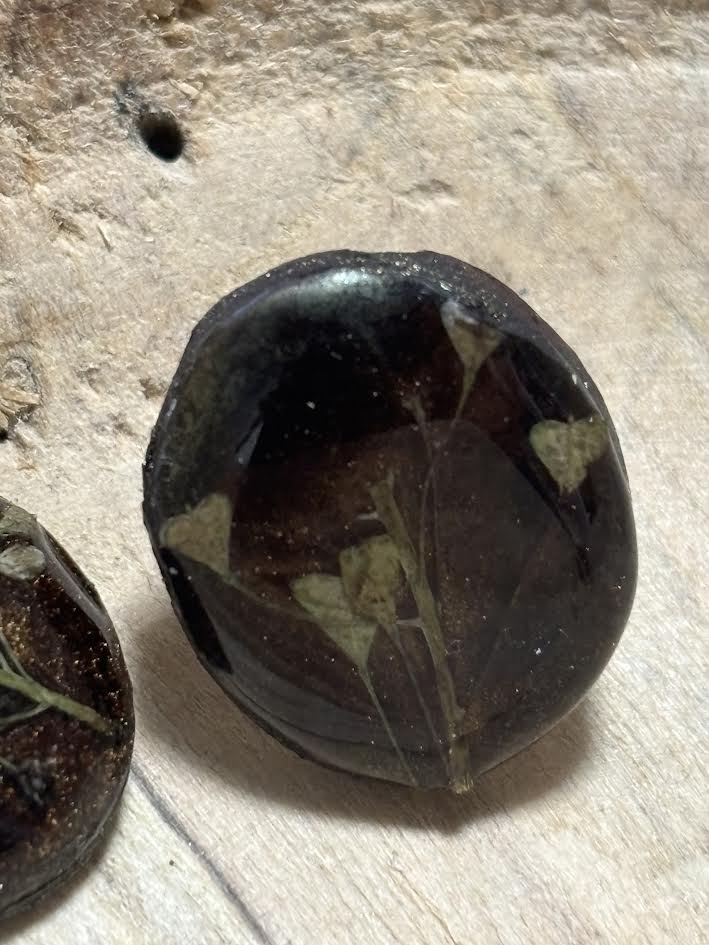 Hand-shaped from polymer clay, the Shadowform Clay Studs feature layered pigment and subtle botanical impressions sealed beneath a smooth resin dome. Dark, earthen tones with gentle depth give these earrings a quiet, grounded presence—simple in form yet rich in detail.
