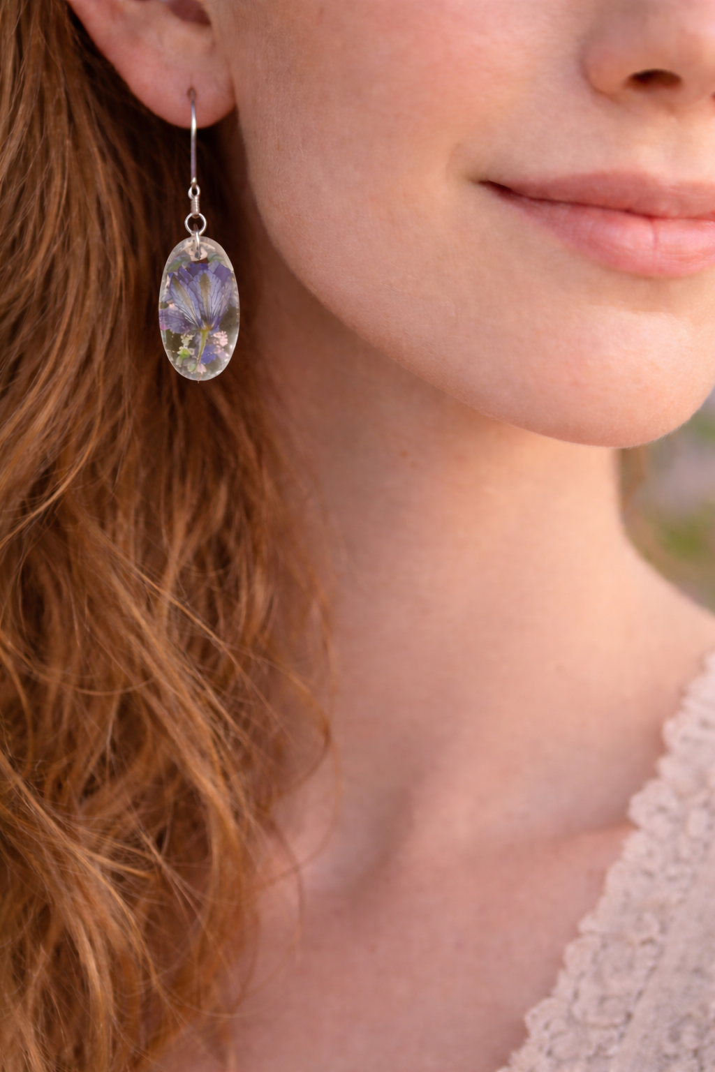 Suspended from silver-tone ear wires, these oval drops carry the feeling of twilight — where light fades gently and petals linger in memory.